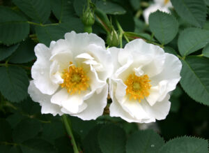 アルバ セミプレナの枝変わり前、親品種とされる説もありますが、葉色などはやや明るい緑のように思います。現時点では交雑種の説が優勢です。花弁の多い八重咲きで中心に淡くピンクがのり、旺盛に伸長します。枝葉の特徴を活かし庭木として活用したい品種。