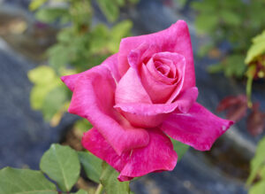 濃いピンクのゆるいカップ咲き。葉は光沢のある照り葉で、房咲きとなり花付きに優れ、満開時は圧巻。春には株が花で覆い尽くされるほど。返り咲きが多めながら伸長力が強く、大株に成長します。