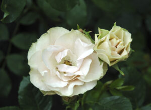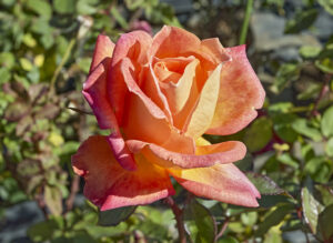 柔らかな黄色の中〜大輪房咲き品種です。整った高芯剣弁で、気候によりローズピンクのぼかしが入ります。ほのかに芳香もあり、枝数多く花付きも良好。照葉が美しく、直立気味のまとまりのよい樹に育ちます。