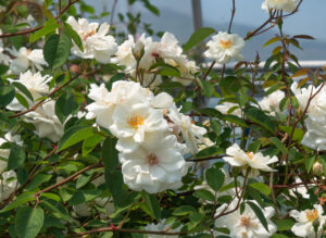 枝先のしなやかさや、枝垂れ下がる枝の姿はあまり持たず、全体的な姿は太い枝による構成です。主幹がしっかりしている性質を考慮して、トレリスや窓辺など、やや高さのある構造物が植栽場所として適しています。