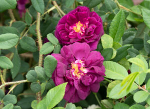 比較的近年に作出されたモスローズで、枝葉の力強さがモダンな印象です。本来のモスローズとは異なり、とげがびっしりといった感じで枝ぶりがやや粗いものの、耐寒性に優れ旺盛に茂る強健さがあります。黒みを帯びたカップ状の花が大変美しく、ダマスクの豊かな香りがあります。仕立ては壁面や高さのあるフェンスに限定されそうですが、美しい花容と色彩、芳香が多くの人を魅了します。
