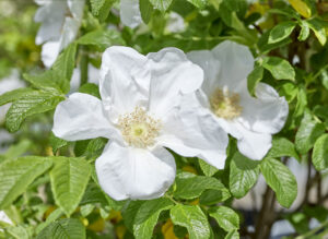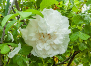 清らかな純白の、大きめの半八重平咲き花で素晴らしい香りがあります。葉も良く茂って美しい。秋には黄葉し、比較的よく返り咲きます。イギリスやフランスでも古くから愛された品種です。