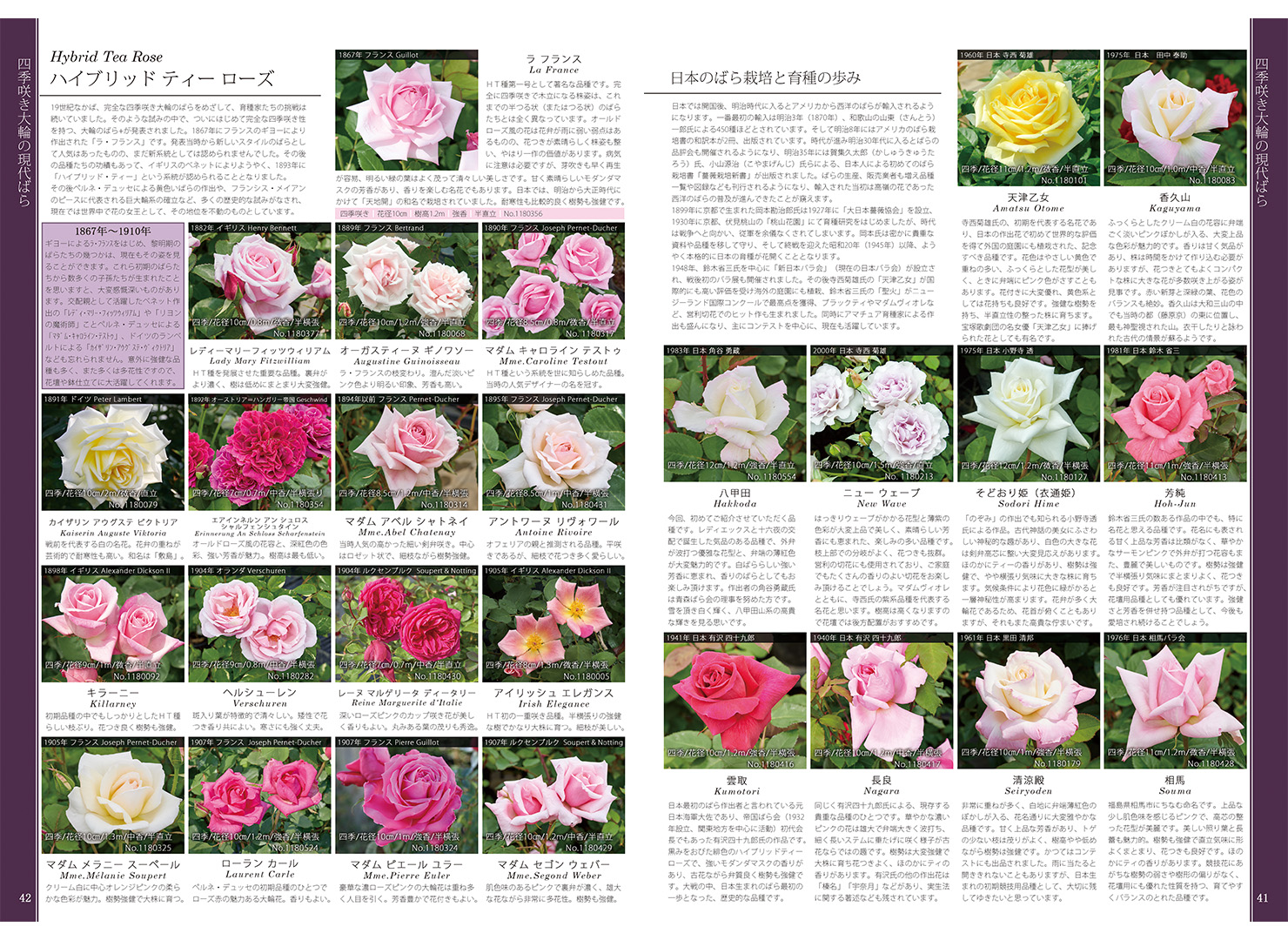 伝統ある品種を多く保有している当園では「ばらの歴史」も重要視しており、「ローズカタログ」にはこれら「ばら史」と言える部分も感じられるよう、編集をしております。