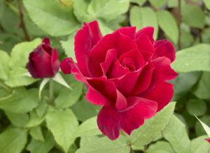 同名ハイブリッドティー「クリストファー ストーン」からの枝変わりつる性。重ねが少なくおおらかな黒赤の花容はそのまま、樹勢強く長く枝が伸びます。ダマスクの香りも豊か。