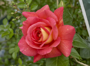 同名ハイブリッドティー「コンデサ デ サスタゴ」からの枝変わりつる性。表弁はローズ赤、裏弁黄色というバイカラーの花が一面に咲く姿は大変華やか。特徴的な照り葉も相まって明るい雰囲気を演出できます。他の枝変わりハイブリッドティーつる性品種と同様に枝が太く伸びるため、壁面などで利用したい。