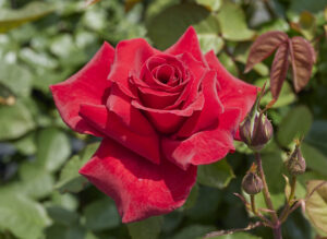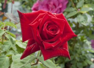この品種によりはじめてビロード調の深紅色が出現し、のちの多くの赤ばらの名花を誕生させた、歴史上忘れることのできない品種のひとつです。またHT種のみならずファッション(F)やスリーズブーケ(S)など他系統にまでその影響は及んでいることも、見逃せない特徴です。横張りで木の生育は緩慢ですが、花付きは良好です。ダマスク系の強い香りにもうっとりします。枝変わりのつる性種も有名です。