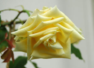 象牙色の堂々たる高芯咲き、弁底にオレンジを帯びる美しい大輪花。重ねも多く花型もよく整います。この色を出す花の中では珍しく耐寒性が強めでとても丈夫な樹。寒冷地向けハイブリッドティー種としておすすめです。