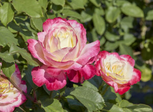 同名ハイブリッドティー「ダブル デライト」からの枝変わりつる性。黄色みがかった白地に非常に強く赤色の覆輪が入る特有の花色はそのままで長くつる状に伸びます。ダマスクの香りも豊か。大輪クライミングらしい太い枝なので、壁面など広い場所で誘引されるとよいでしょう。