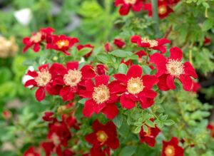 鮮やかな赤で中心が白く抜け、おしべが目立つ華麗な一重咲きつるばら。返り咲きがある。フロリバンダの登録だが枝はシュラブ状に伸びるのでつるバラとして扱う。