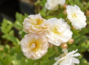 白地に中心はクリーム黄色の小輪花。黄色い小鳥の名に相応しいやさしい印象です。花は徐々に白に咲き進みます。花付きはとても多く、枝にはトゲが少ないので様々な場所へ便利に使っていただけます。ライトグリーンの照り葉も美しい。結実性もよく、秋には実も楽しめます。