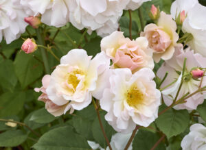 交配親にペネロープを持つ品種で、アプリコットイエローに淡くピンクが載る、柔らかな色調が魅力的です。半八重のシンプルな花が大きな房になって咲き、樹は半直立気味に強健に育ちます。背丈もフロリバンダ種としては高めになります。