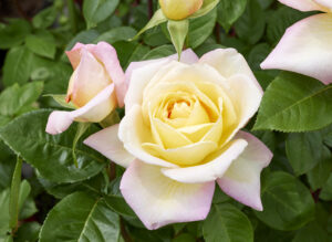 同名ハイブリッドティー「グランメール ジェニー」からの枝変わりつる性。弁端がわずかにピングがかる黄色の鮮やかな花が多数開花します。濃緑色の照り葉との相性も良い。