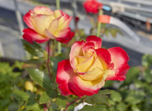 表弁はローズレッド、裏弁は黄色の華やかな色彩でトゲがほとんどなく扱いやすいつるばらです。誘引しだいで幅広い用途に対応できます。ドロシー パーキンスの血を引き、柔軟な枝は誘引しやすい。
