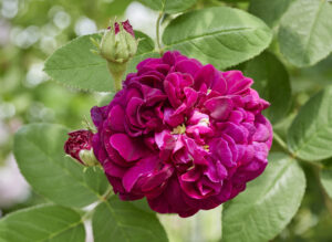 燃えるような赤色の大きな花が目を引く品種です。1982年作出の新しいガリカローズです。枝葉にはガリカの趣を残しつつ、近代的な赤色の花が絶妙にマッチしています。