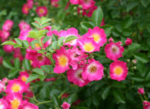 極めて花付きが良いのが特徴。ワイルドベリーを思わせる野趣あふれる花はブライトピンクの一重で大きな房咲きになる。トゲは多い。