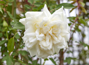 美しい白のロゼット咲き花で中心はクリームがかります。ライムグリーンの葉との対比が良く、株全体が非常に清らかな印象です。伸長力は強く枝の線を活かして窓廻りやパーゴラなどにお勧めです。大きめの花なので見応えがあり、さわやかなティの香りも楽しめます。やや遅咲きですが、春以降も返り咲きがあります。
