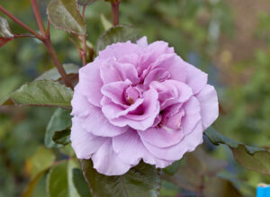 一重~半八重系のシンプルなお花に、中心赤みのあるおしべが魅力的です。少しベージュを含む紫色は初期の紫系品種によく見られ、最近の品種のように青みが強くないのですが、やさしく味わい深い色調です。花房自体は小さいのですが、細い枝が半横張りにたくさん出て茂りますので、結果的に多くの花に覆われます。白い壁際などによく映える、優雅で稀少なフロリバンダローズです。