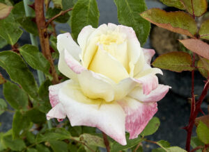 気品に満ちた淡い黄色の整形花です。端正な剣弁高芯咲き大輪花で約 25 弁程。直立の樹形で株立ち状に伸びる。枝立ち良く素直な枝で、初心者が剪定位置に戸惑う事は少ない。完成度の高い品種です。