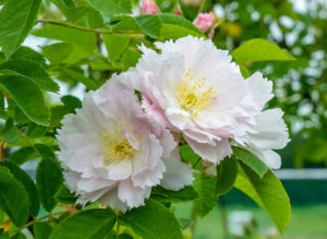 最も伸長するノアゼットローズでトゲが少なく、象牙のような花の色彩と株全体の柔らかい雰囲気に人気があります。伸長力が強くステムが長めですので小スペースでは生かしづらく、壁面や大きめのガゼボなどでゆったりと咲く姿を楽しみたい品種です。枝先は誘引せず遊ばせてあげると良いでしょう。ティーの香りがあり、夏までは返り咲きも楽しめます。明るい緑の枝葉も美しい。寒さに弱いため、北側への植栽は避けます。寒冷地の方は防寒対策が必須です。
