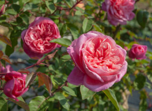 サーモンオレンジを帯びたピンクの剣弁咲きで、気温による発色の変化が目立ちます。日本の暖地ではピンクが強くなるようです。花弁数は多く中心部は色濃く翳ります。比較的大型の樹形。