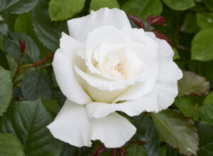 象牙白の花色で半剣弁高芯咲き。長く切花品種として用いられた独特の雰囲気を持つ品種です。小粒な花容で花径は 10cm 前後、約 30 弁。花付き多く木は半直立高性。特徴ある樹形です。四季咲き品種最強の強健種と名高い「クイーン エリザベス」の子供、親譲りの強健種です。世界ばら会議、1991年のイギリス「ベルファースト大会」においてに7番目の殿堂入り品種として登録されました。
