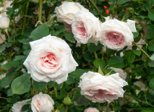淡いピンクで中心はやや濃く、花弁数の多いクラシカルながら優しい風情の花です。花付きがとても多く株を覆って咲く姿はとても見事、樹も形良くまとまり花壇、鉢植えどちらにも向いています。