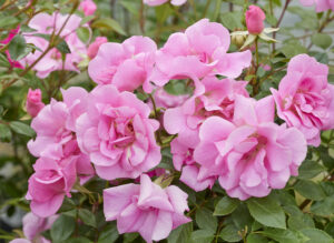同名ポリアンサのつる性。明快なピンクの中輪で弁端は波打つ。繰り返し咲く性質と枝が伸びる性質を併せ持つ。枝にはほとんどトゲがない。通路脇や玄関周り小型アーチなどに使える品種。
