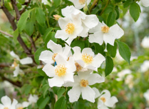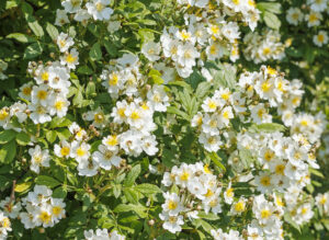 白の小輪半八重の大房咲き。株一面に花をつける。主幹は直立し自立する。小枝が密生しトゲも鋭いので、誘引で形づくるよりは樹木に這わせるなど、自然樹形を生かした栽培が良い。