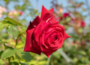 レッド デビルの子供。少し黒みがあるスカーレット色の半剣弁高芯咲き。樹は丈夫でしっかりしています。香りがあります。