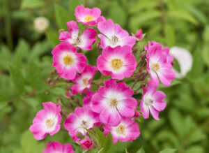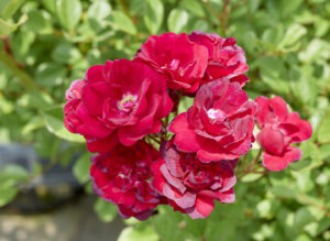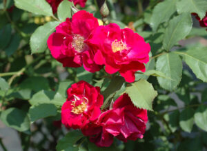 ローズ赤の半八重咲きで返り咲きがあり、アイスバーグなどフロリバンダローズの交配親としても、興味深い品種です。