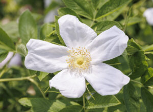別名「シナモンローズ」の通り枝は赤褐色で、シナモンを思わせます。アーチ状に伸びた枝から細いステムを出して枝に行列したような花姿になります。秋には紅色の丸い実を付けます。
