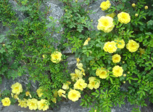 中近東原産の珍しい純黄色の原種。花は濃黄色の一重咲き、ステムは短く、トゲの多い細い枝にそって並べたように咲きます。非常に早咲きの品種で、平地では4月辺りから咲き始めることもあります。
