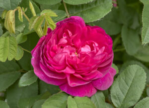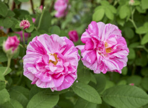 もっとも古代のガリカローズに近いと思われる品種で、薬用植物をあらわすアポテカリ・ローズの別名をもちます。ヨーロッパでは古くから薬用・香料用に用いられた品種です。ガリカローズらしい野性的な葉。軽やかな印象の花に黄色いおしべが美しく、どのような仕立てでもよく咲きますので庭園素材としても優れています。枝を長めに使ってアーチやオベリスクの他、繊細な枝振りを生かして小灌木のように扱ってもよいでしょう。本品種の絞り咲きタイプが「ロサ ムンディ」になります。