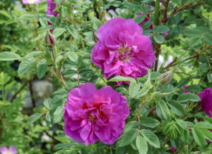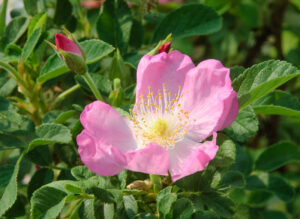 ルゴサ系統の親と考えられている「ロサ ルゴサ」の一重タイプです。葉脈がはっきりとでる特徴的な葉、トゲの多い固い枝に濃いピンク色の花が咲きます。耐寒性は抜群、病気耐性もあります。秋になると大きな赤い実を付けます。