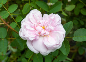 バラの仲間では最もトゲの多い部類のひとつ。野趣あふれる黒褐色の細い枝は半直立の株立ちに育ちます。清楚な白花多花性で実付きもよく、特に赤みを帯びた黒い実はこの系統独自のものです。
