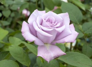 濃い藤色の花色は現在見ると赤みが強く、花名ほど青くはありません。しかし樹勢が良く花付きも多いので、作出当時は切花用品種として活躍しました。強い香りも魅力のひとつ。