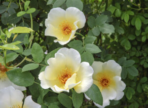 花弁数の少ない、ゴールデンイエローと覆輪にうすく紅色がさす非常に珍しい花姿をしている品種です。ティーローズのような細い枝で俯いて咲くことが多いですが、樹勢は強く横張り気味に大きく育ちます。枝間が開きやすく扱いにくい枝ぶりですが、初期黄色品種として、そしてアメリカのばらの歴史を変えた「シャーロット アーム ストロング」の親品種として貴重な品種です。ティー香があります。