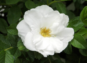 ブラン・ドゥブル・ド・クベールの実生品種とされ、より花弁が多くなり、くしゅくしゅとしたロゼット咲きとなっています。トゲの多さは相変わらずですが、自立気味に伸び、耐寒性も高く丈夫な品種です。