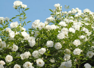 つるのサマースノーが四季咲きに変異をおこした品種です。つる性から四季咲きへの変異は大変珍しい。透明感のある白に美しいライムグリーンの葉は親品種とまったく同様です。葉質がやや弱いので、うどんこ病やハダニには注意が必要ですが、花付き、花持ち抜群です。低くこんもりと茂り、花壇では手前の植栽に適します。