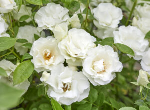 白いさざなみのように大きな房になって咲き、波打つ花弁が美しくとても気品があります。枝にトゲがないことでも良く知られ、葉も綺麗で白つるばらの名花として今後も長く栽培されることでしょう。