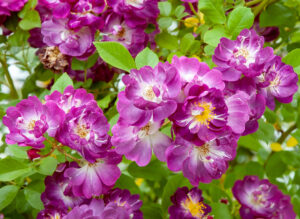 すみれ色の小輪、美麗花。赤味を帯びた咲きはじめから散り際の青が載るまでどの段階も美しい。枝は気まぐれに長く伸びる。とげは少なめ。鑑賞のためには午後から日陰になる場所が良い。