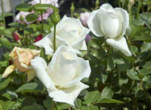 名花ホワイトクリスマスのつる性種、香りがよく堂々たる巨大輪ですが雨に弱いのが惜しまれます。それだけに良く咲いてくれた時の感動もまた深いものです。香りも強い。